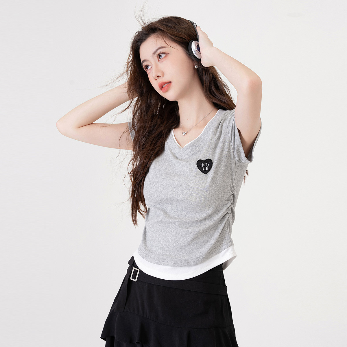假两件抽褶收腰女式t恤夏拼色短袖上衣女修身内搭打底 916363
