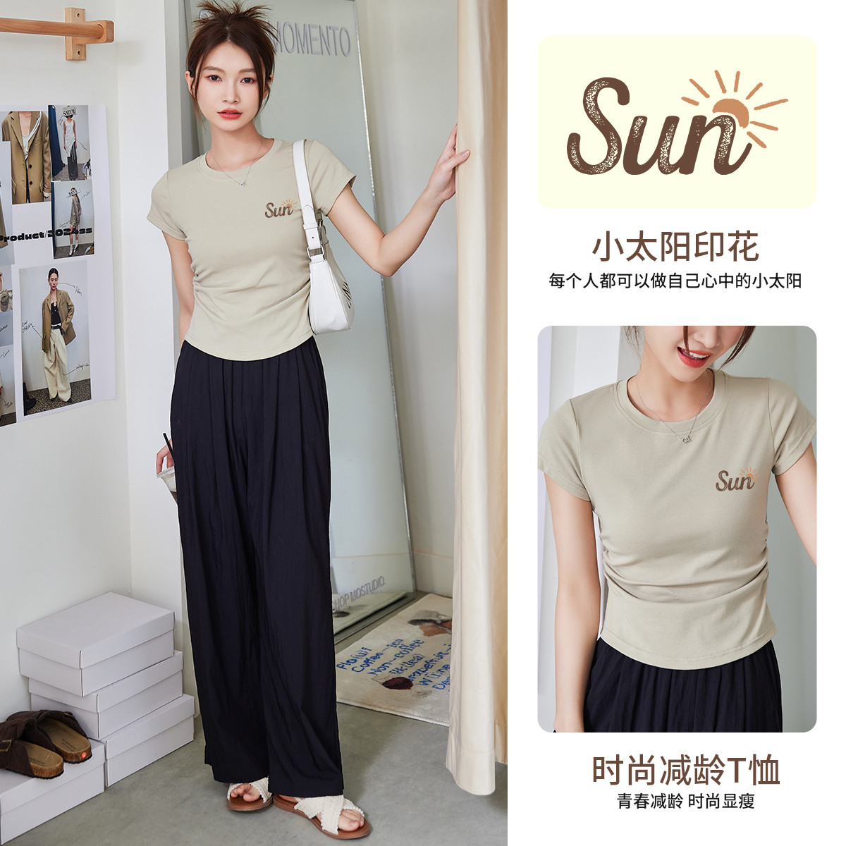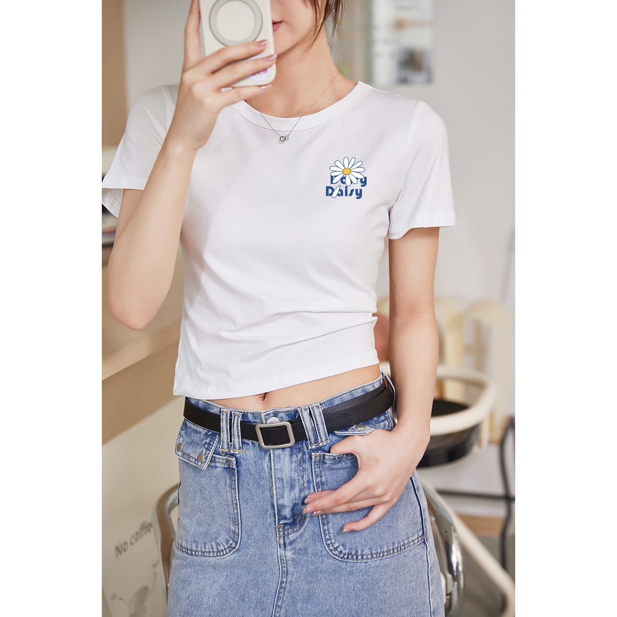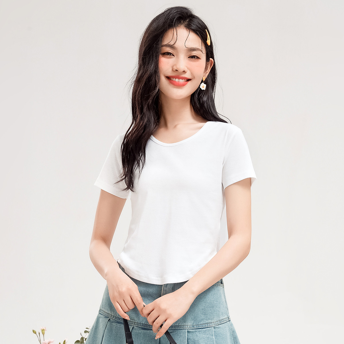 米子旗夏款圆领女士T恤休闲百搭收腰修身短款正肩短袖女 137050