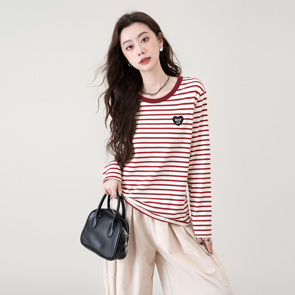 春季款韩系长袖上衣女圆领条纹打底针织内搭女式t恤 197323