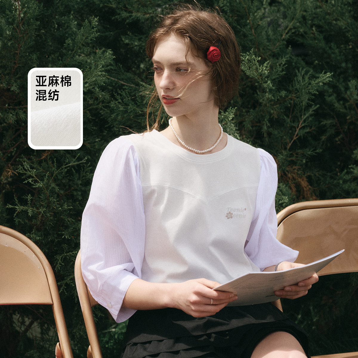 【亚麻混纺】小熊夏季款拼接款中袖T恤宽松女士 282433