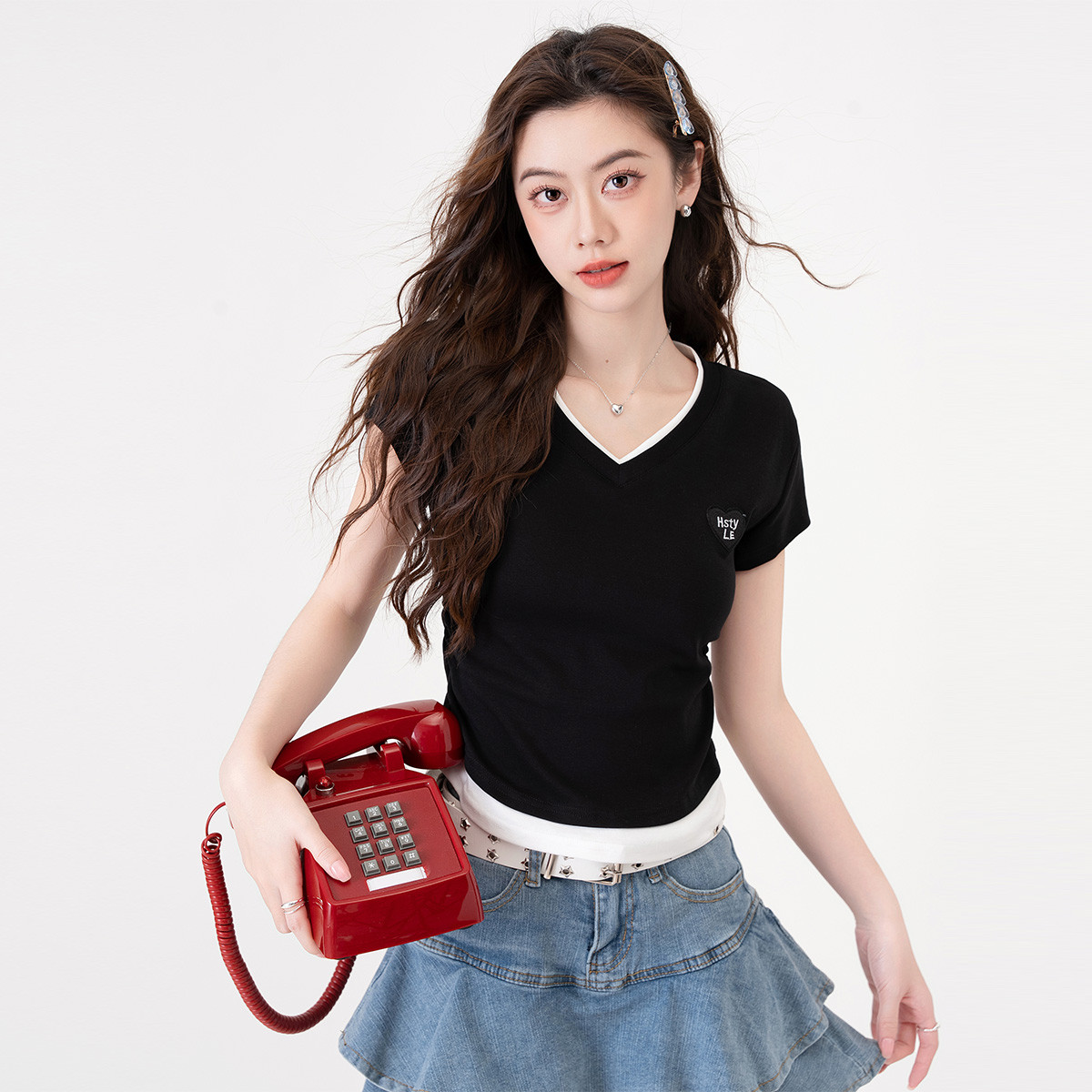 假两件抽褶收腰女式t恤夏拼色短袖上衣女修身内搭打底 617355