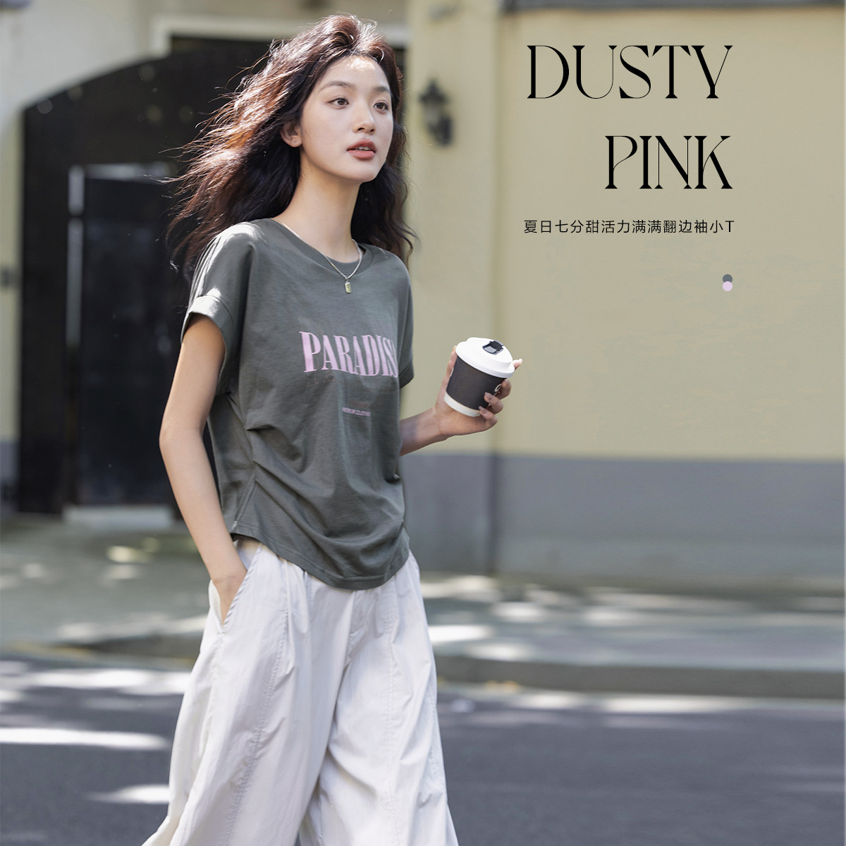 米子旗夏季圆领字母印花女式大码T恤宽松休闲慵懒风短袖上衣 516506