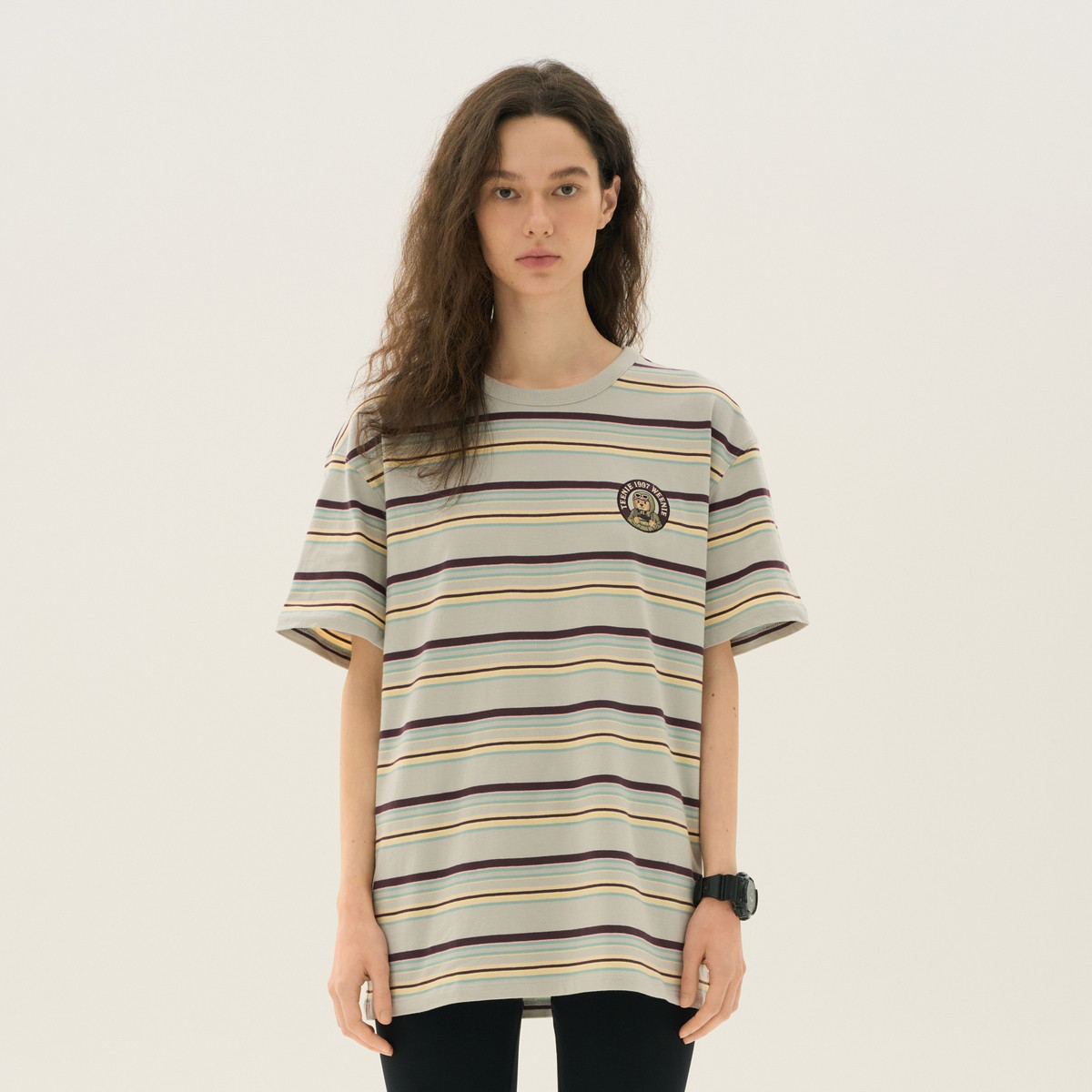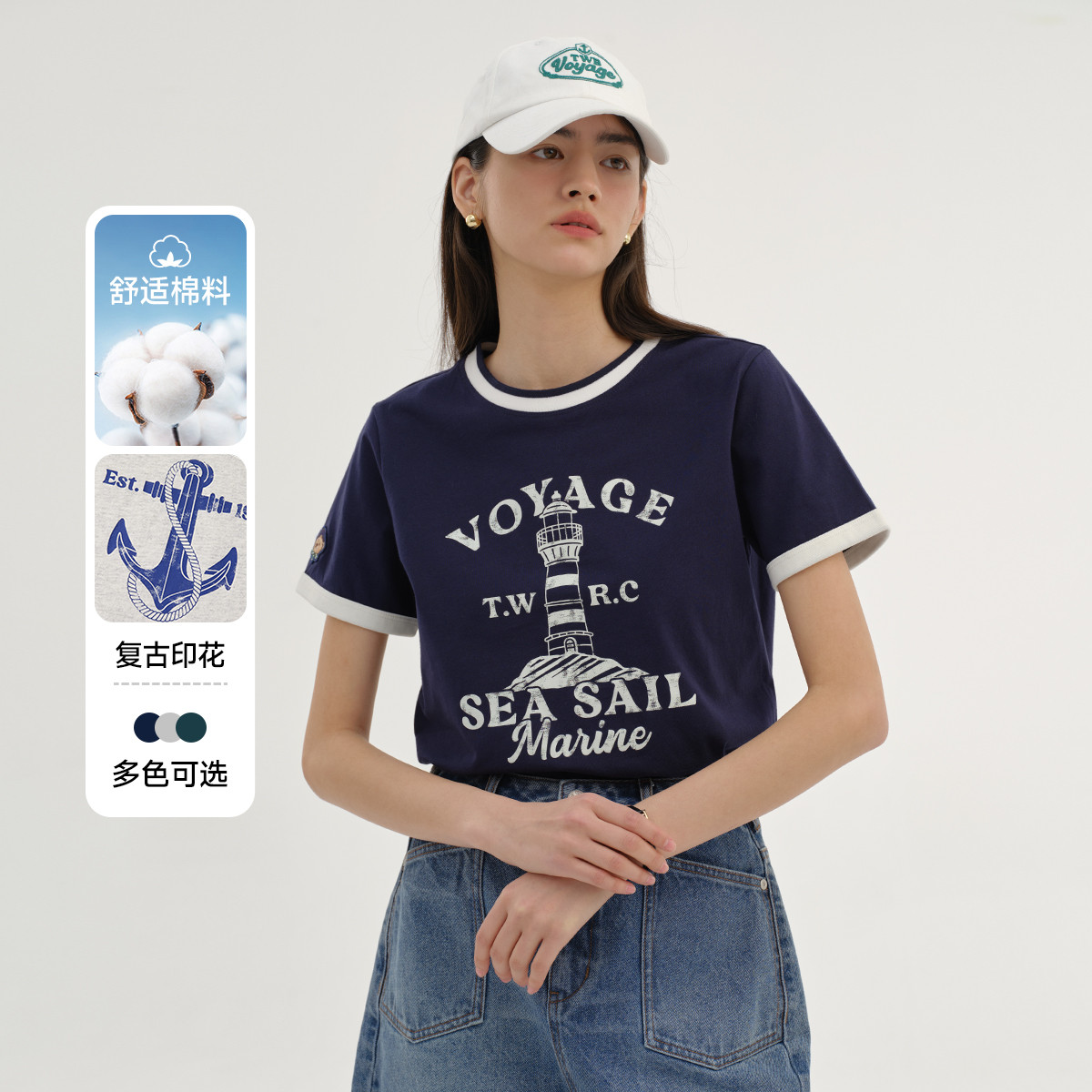 【复古情怀】夏季圆领条纹撞色短袖t恤女刺绣时髦舒适女式t恤 912065