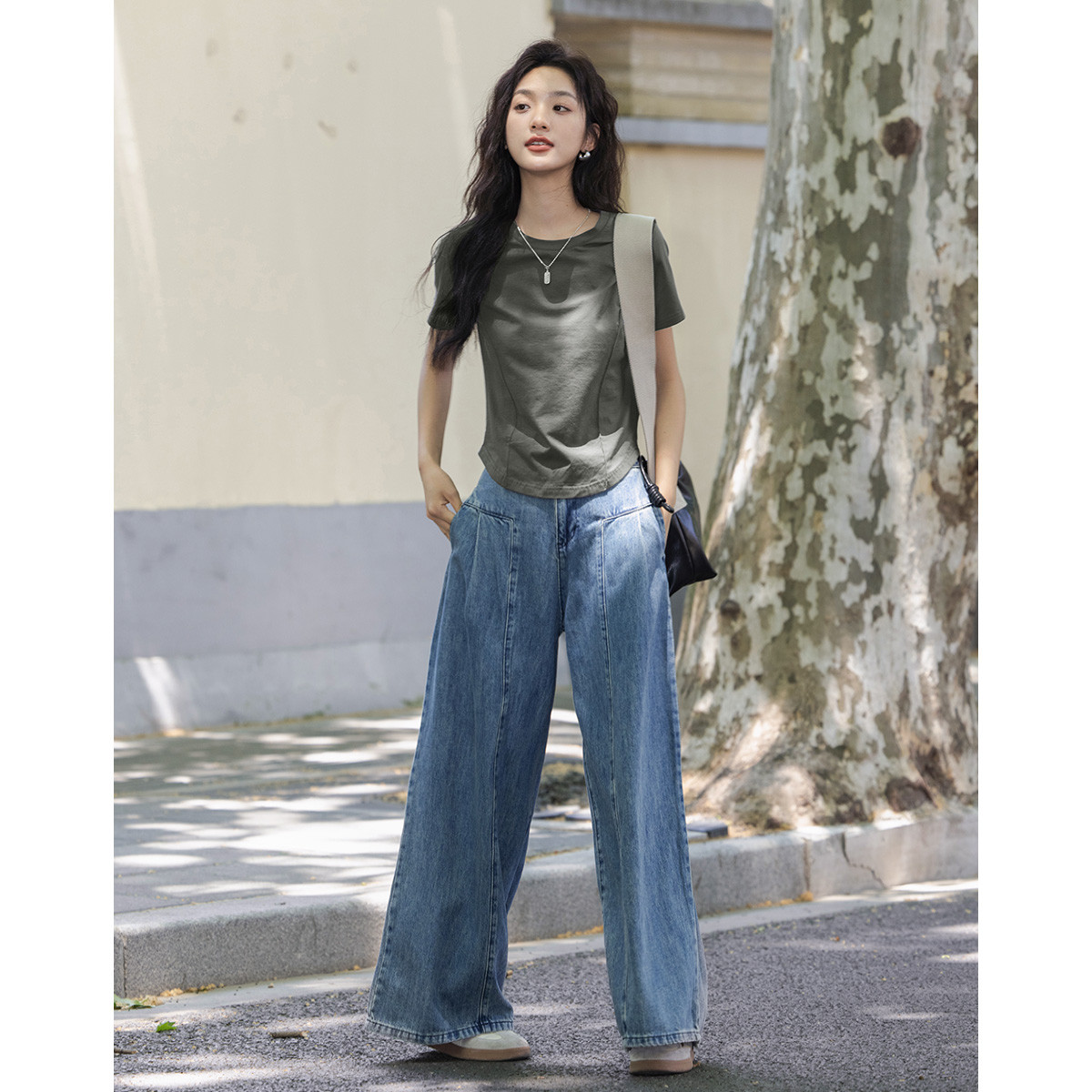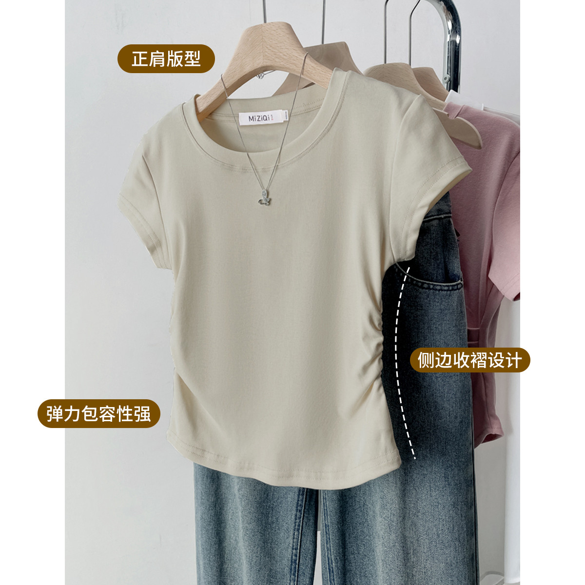 米子旗夏装款圆领侧边褶皱T恤女修身短款短袖上衣 323354