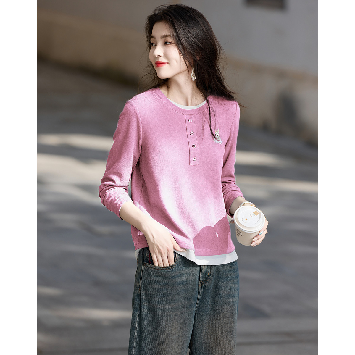 【兔子拼色假两件女式t恤】春秋季通勤圆领长袖t恤女 535297