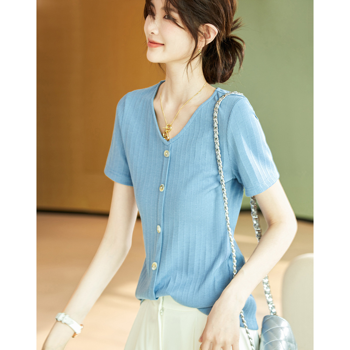春夏轻薄透气简约百搭纯色打底衫含桑蚕丝V领短袖T恤 611923