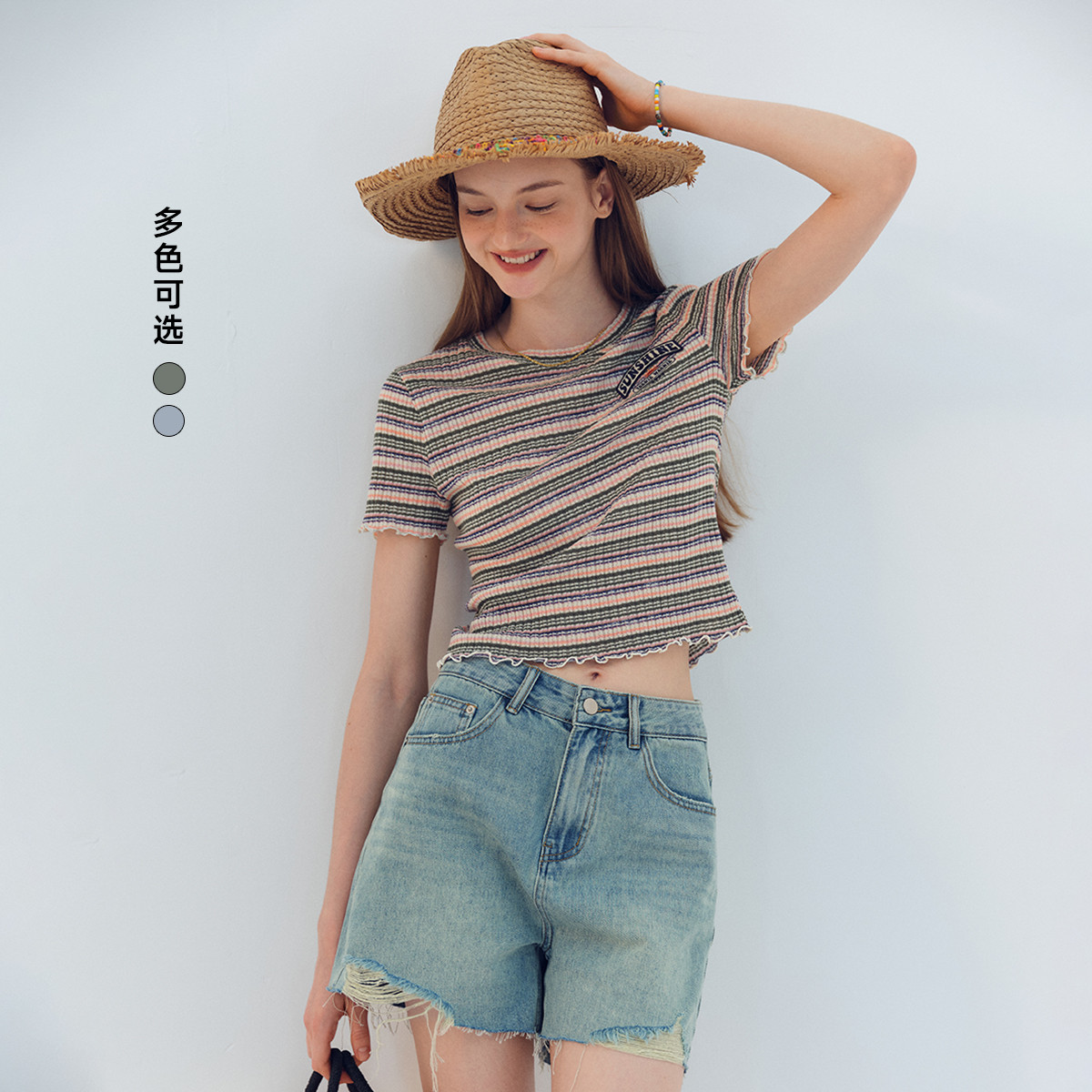 小熊夏季简约撞色条纹短款短袖T恤基础款复古时髦女 368641