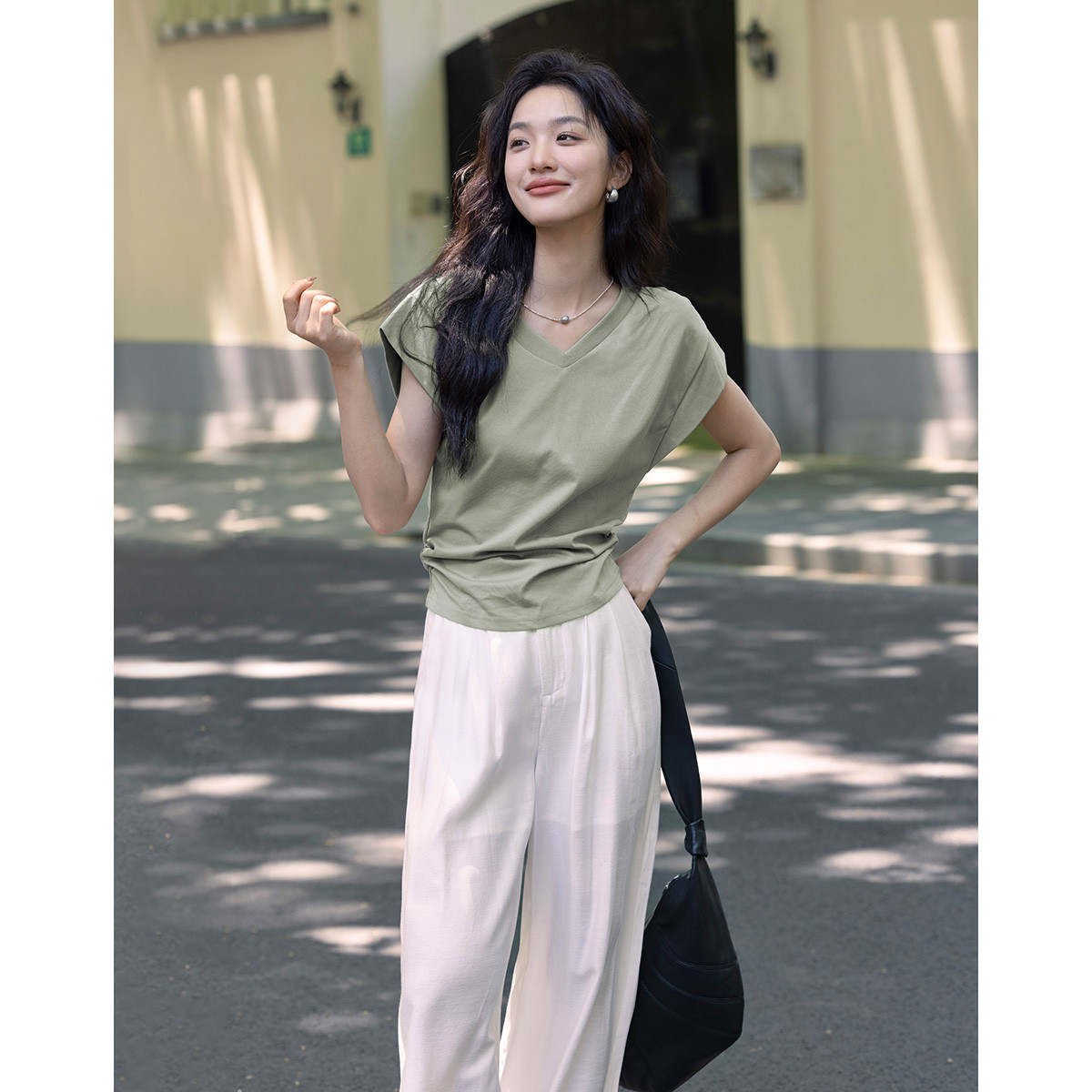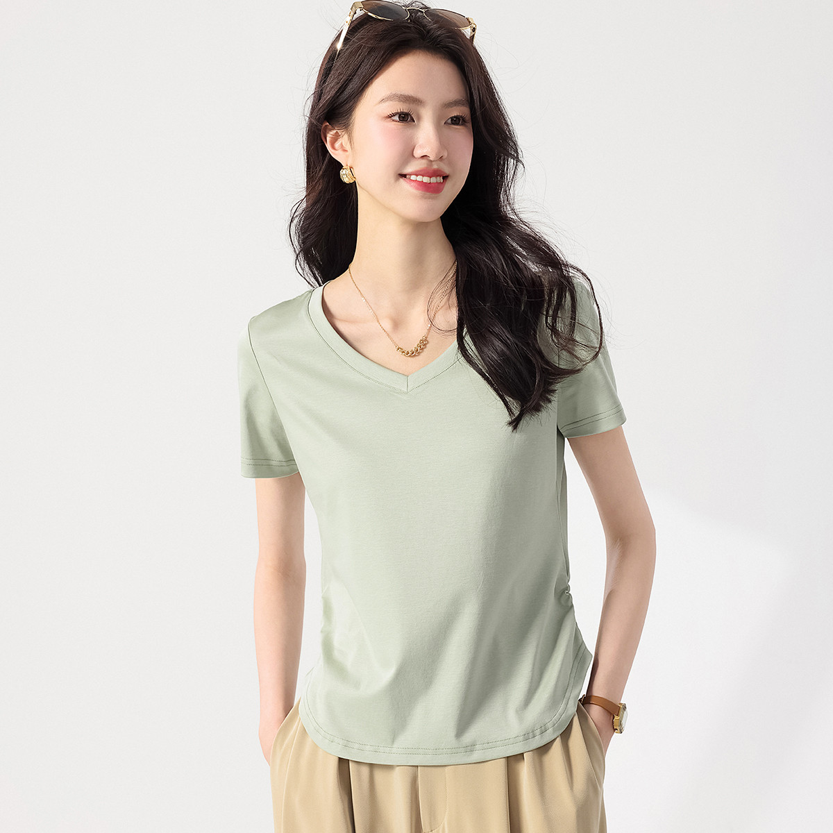 【豆绿V领肩部层次感短袖】夏显瘦侧边抽橡筋装饰T恤女 697858
