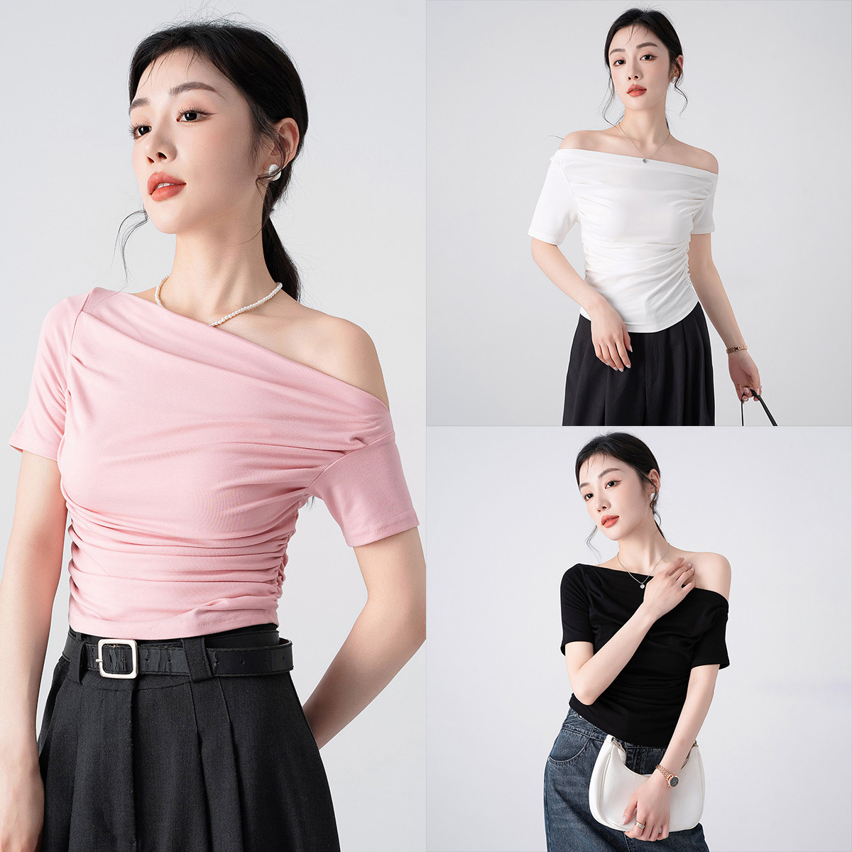 法式一字肩短袖t恤女设计感小众夏季修身显瘦褶皱打底衫露肩上衣 207704