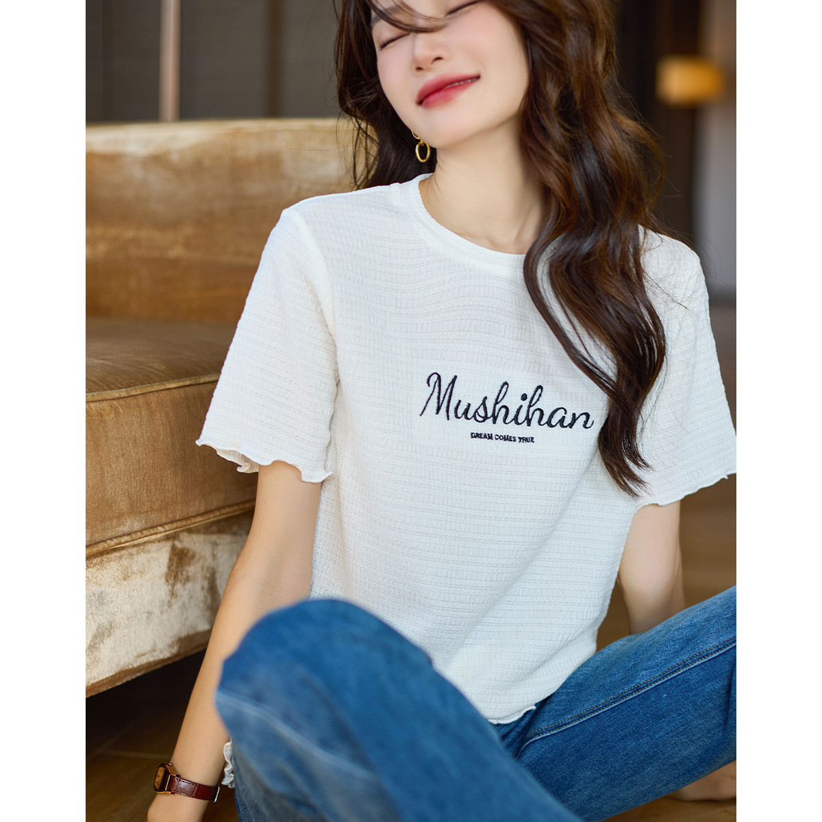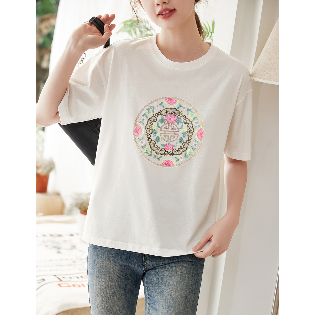 百搭舒适绣花短袖白T恤女2025夏季时尚宽松显瘦休闲圆领上衣 663305