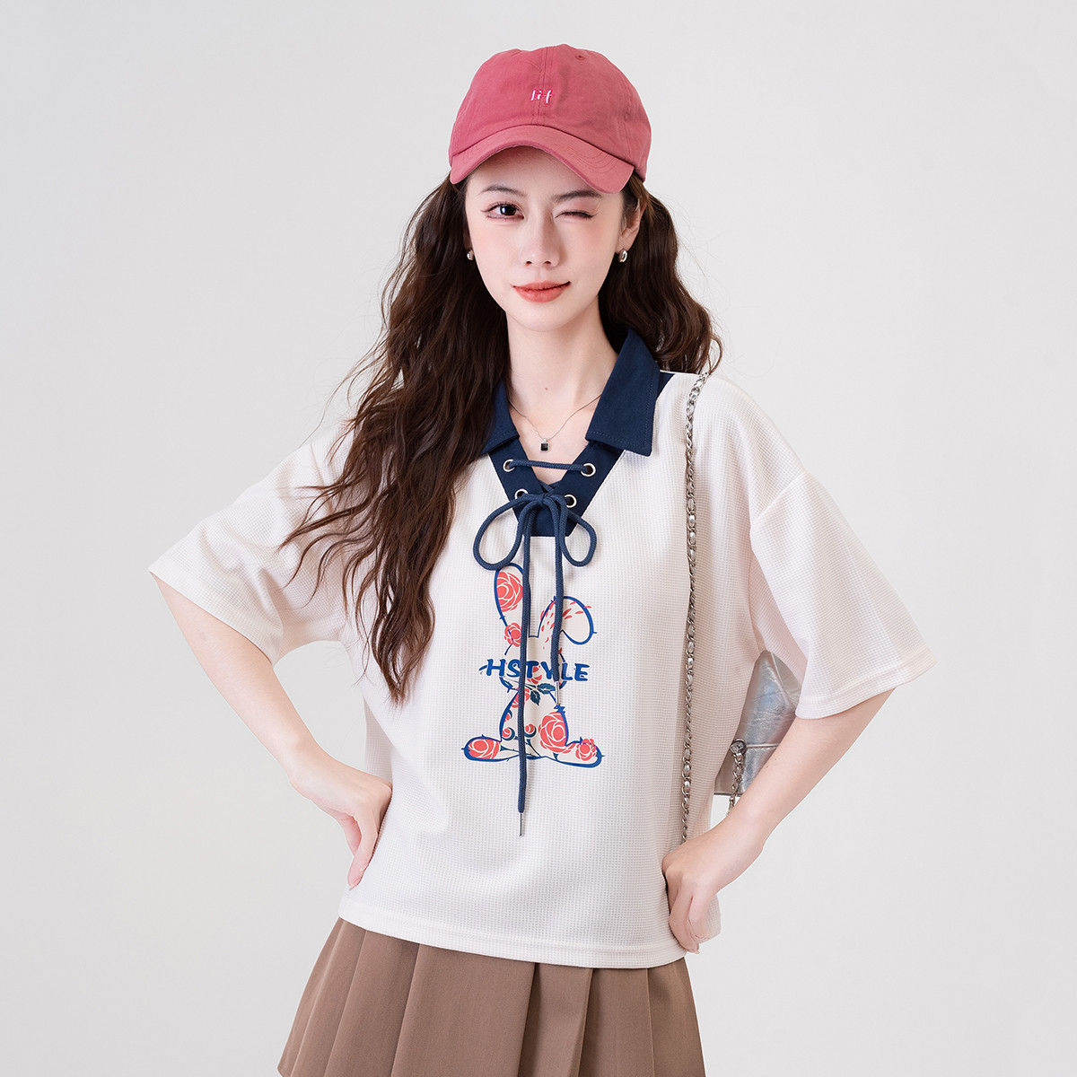 撞色翻领抽绳绑带半袖t恤女夏短袖女士拼色印花上衣 328459