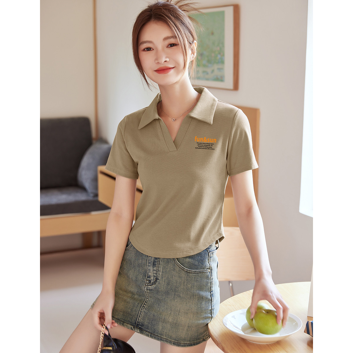 米子旗夏季款印花polo领T恤女短款修身短袖上衣 299354
