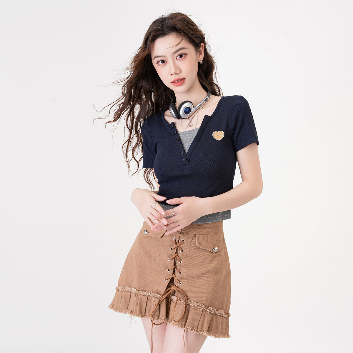 撞色假两件修身短袖女夏美式纯欲内搭上衣女短款打底 211275