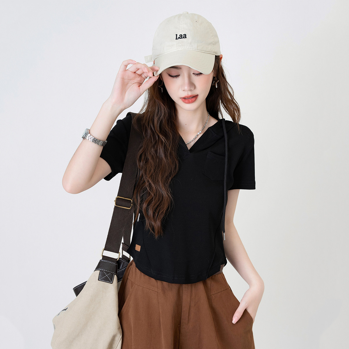 运动风连帽修身短款女式t恤夏休闲上衣打底衫女士短袖 650699