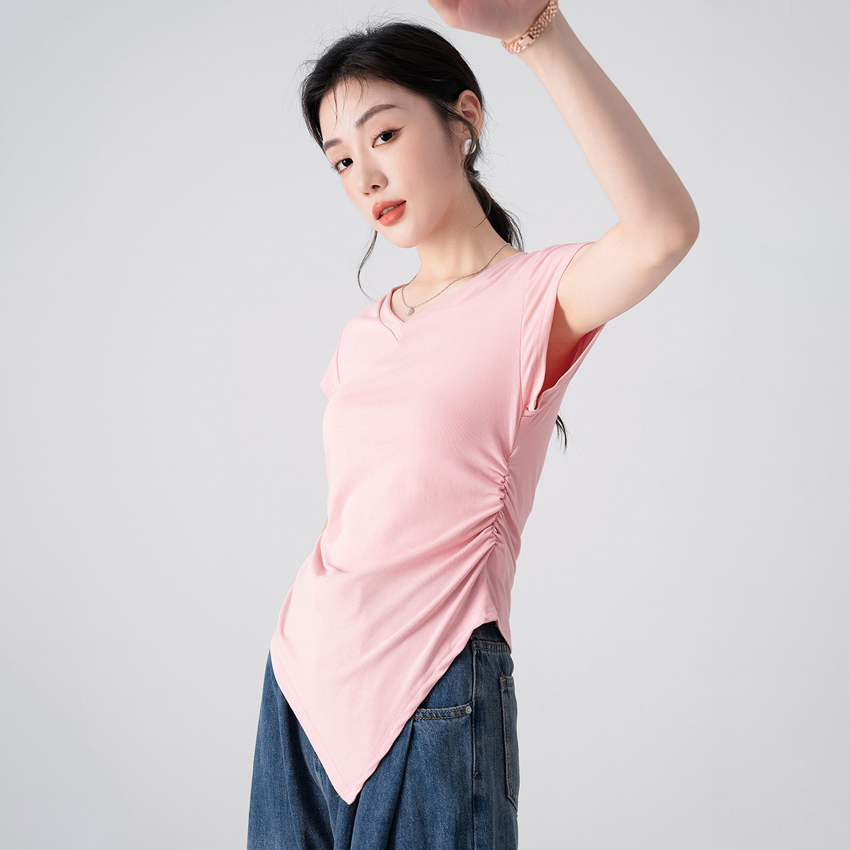 纯色v领正肩短袖T恤女夏季不规则弧形下摆褶皱收腰修身辣妹上衣 265048