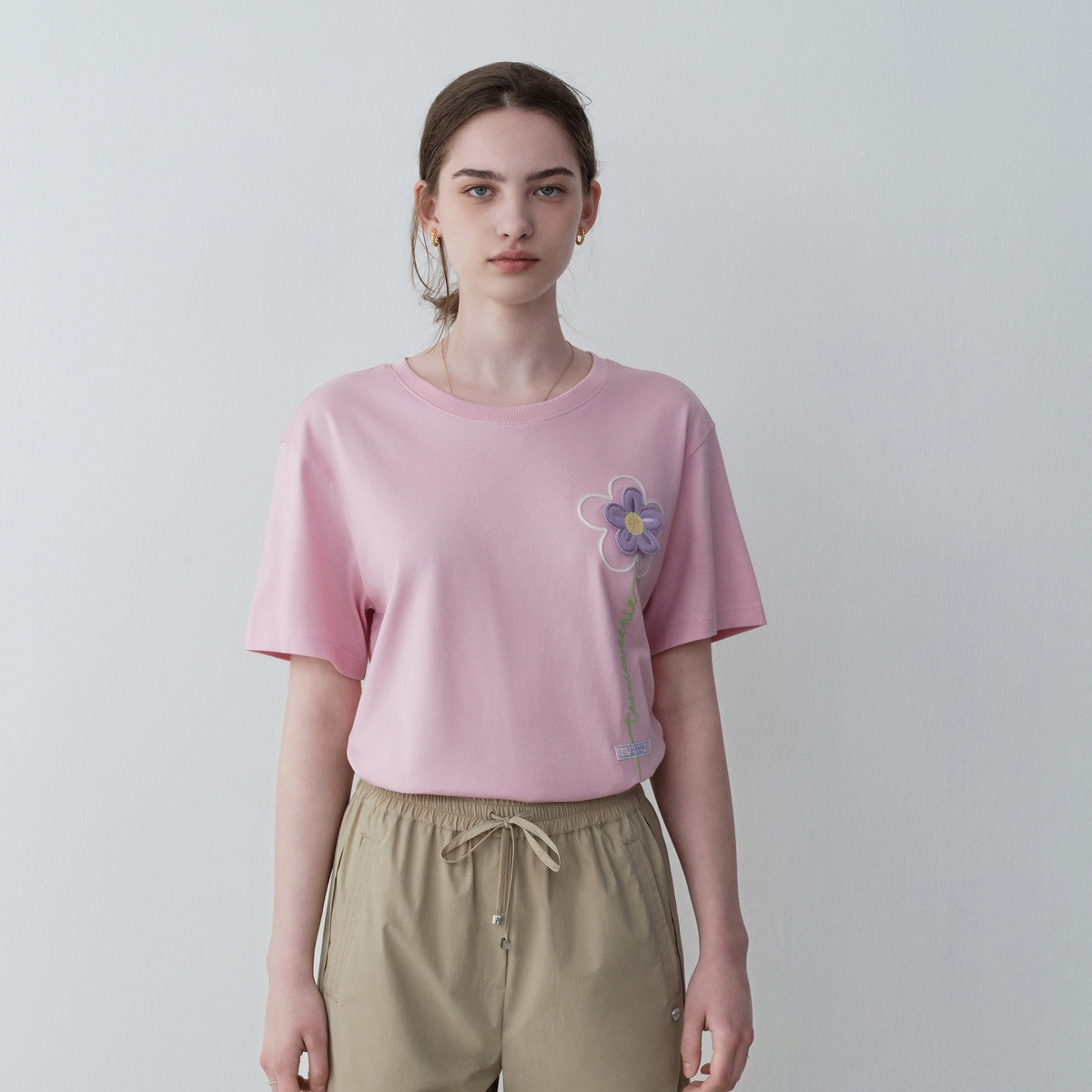 小熊女装夏装宽松短袖T恤花朵刺绣上衣粉色 507585