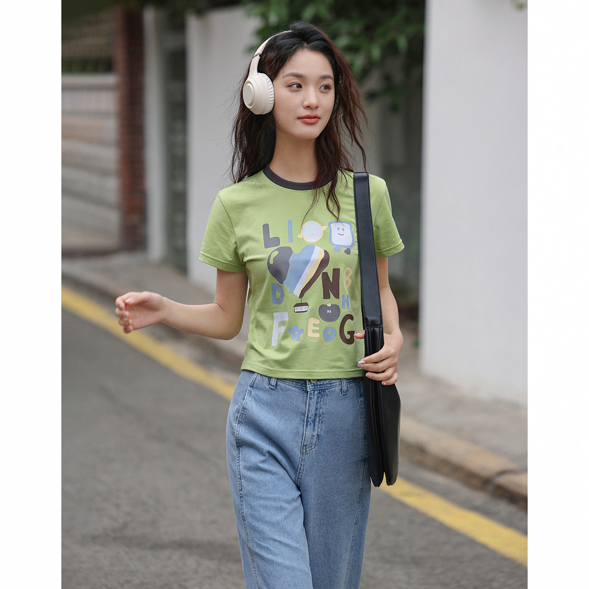 【学院风修身小T】夏款圆领字母印花撞色领口短款短袖女 274498