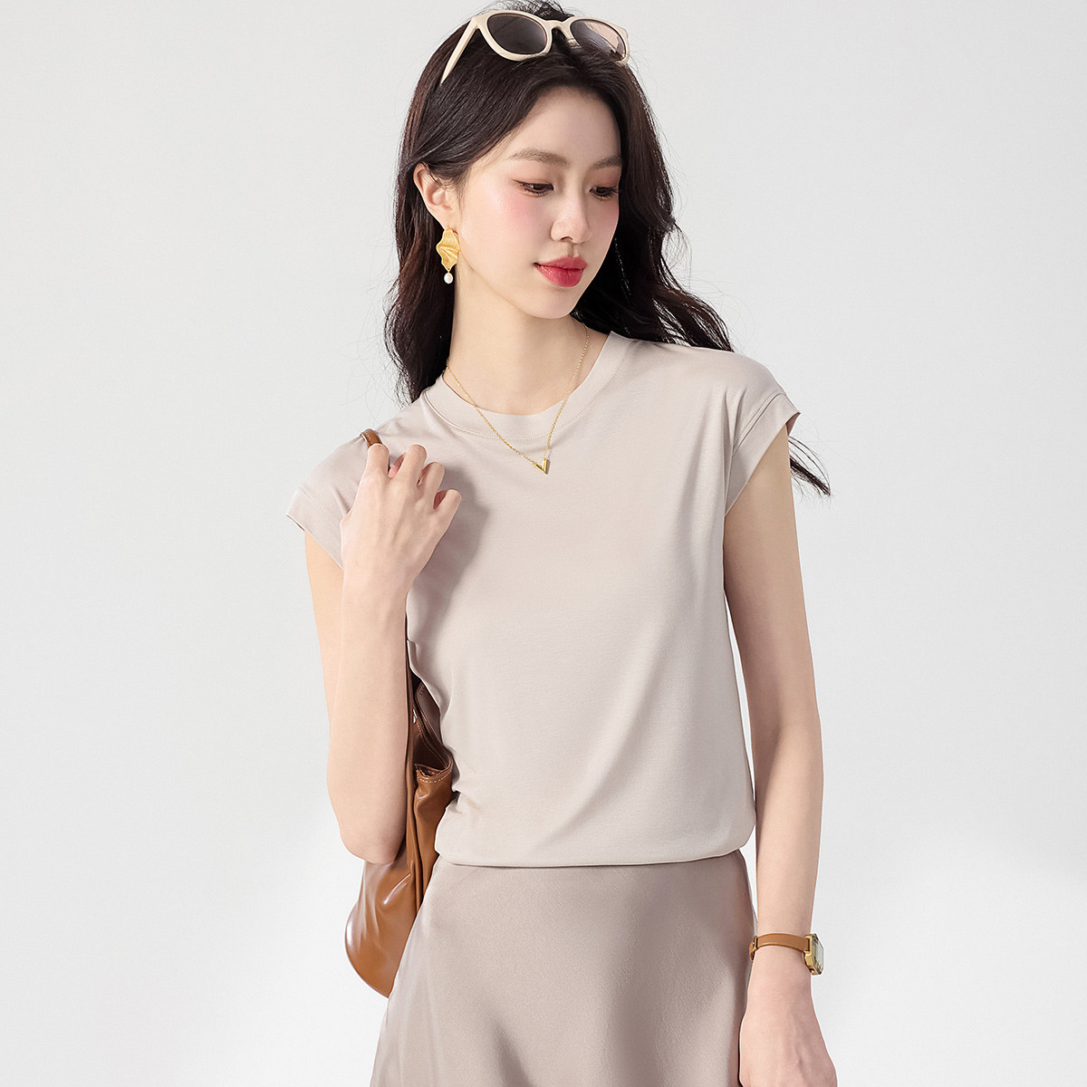 春夏轻薄透气简约百搭纯色打底衫含桑蚕丝圆领短袖T恤 648787