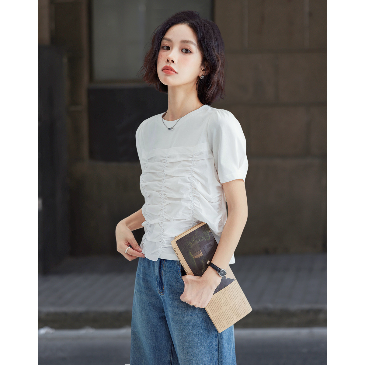 【清爽感白T】夏款时髦不撞款造型感捏褶轻薄透气短袖女 669762