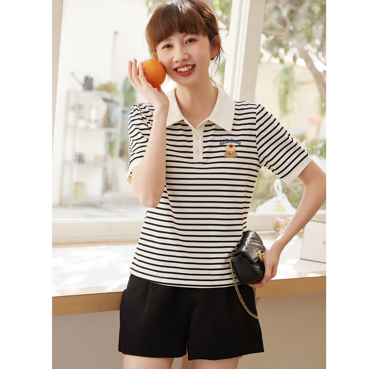 米子旗夏季POLO领印花女式T恤条纹撞色设计宽松休闲短袖上衣 375322