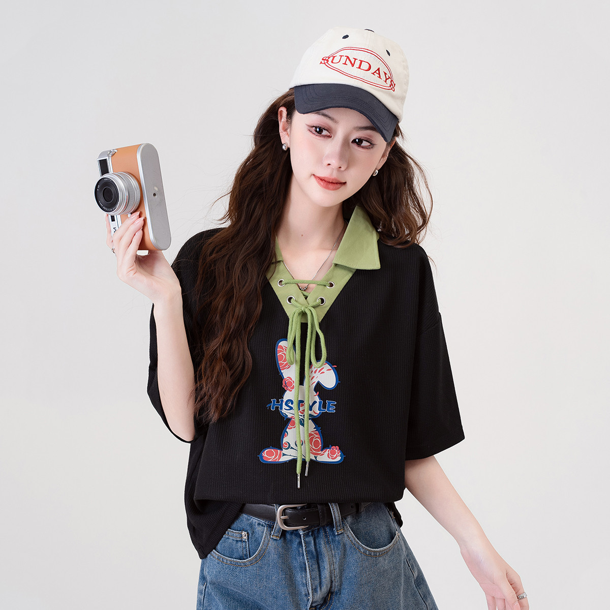 撞色翻领抽绳绑带半袖t恤女夏短袖女士拼色印花上衣 398091