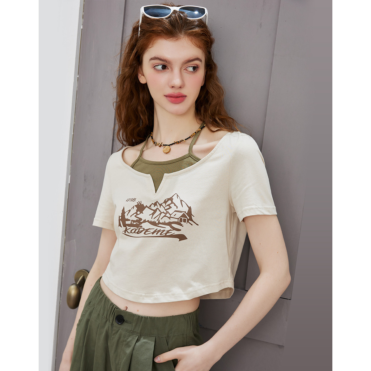 【性感挂脖】简约撞色假两件设计感纯棉女式T恤夏季短款 861085
