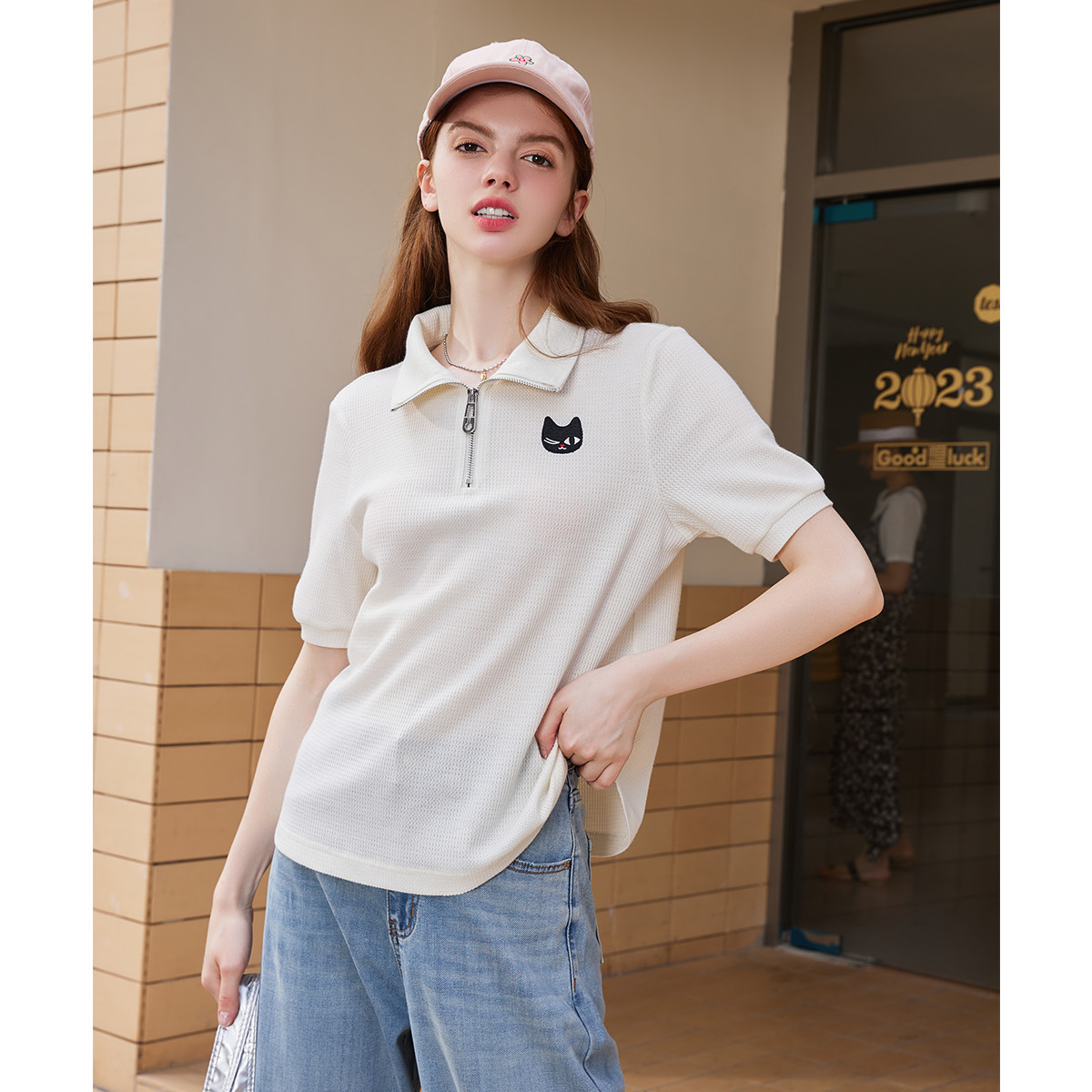 简约纯色POLO领短袖夏季小清新刺绣设计宽松女式T恤 414813