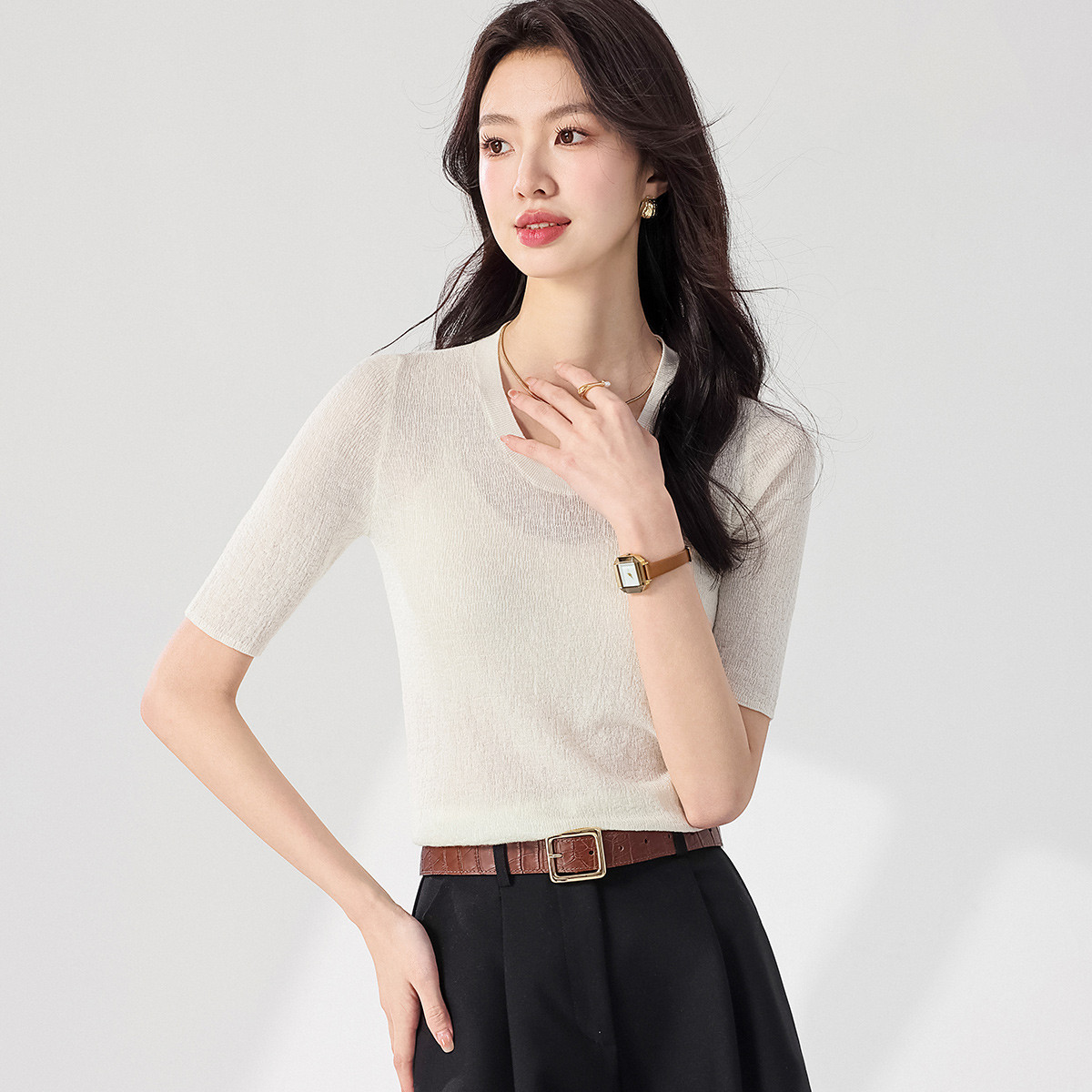 春夏轻薄透气简约百搭纯色圆领含桑蚕丝针织打底短袖T恤衫 145235