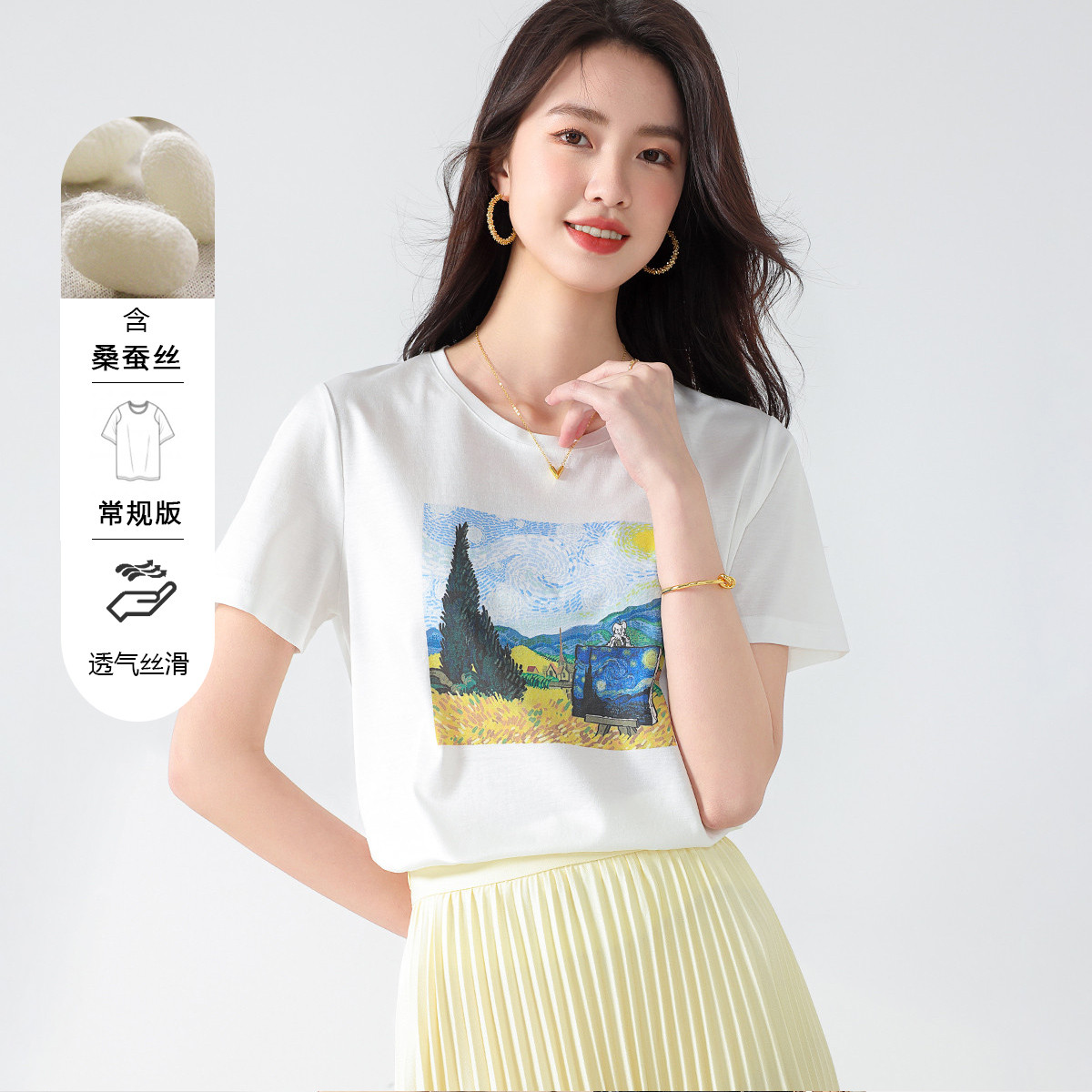 【含桑蚕丝】夏款轻薄透气印花圆领短袖女式T恤打底衫 690131