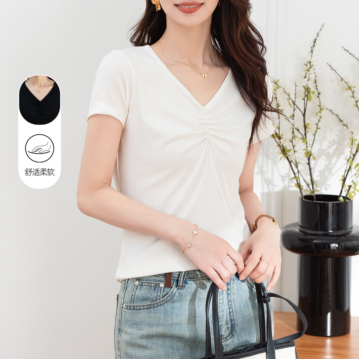 抽褶纯色短款上衣女夏季爆款修身舒适休闲简约气质V领短袖T恤女 307713