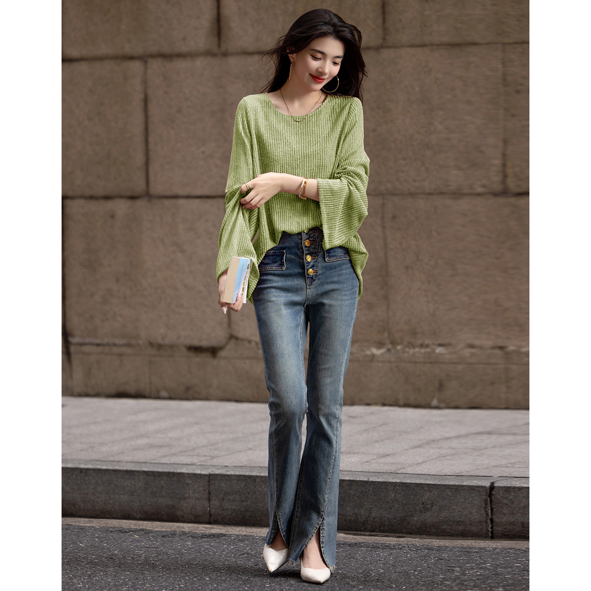 米子旗春秋款圆领女式T恤纯色宽松下摆开叉设计长袖上衣 544474