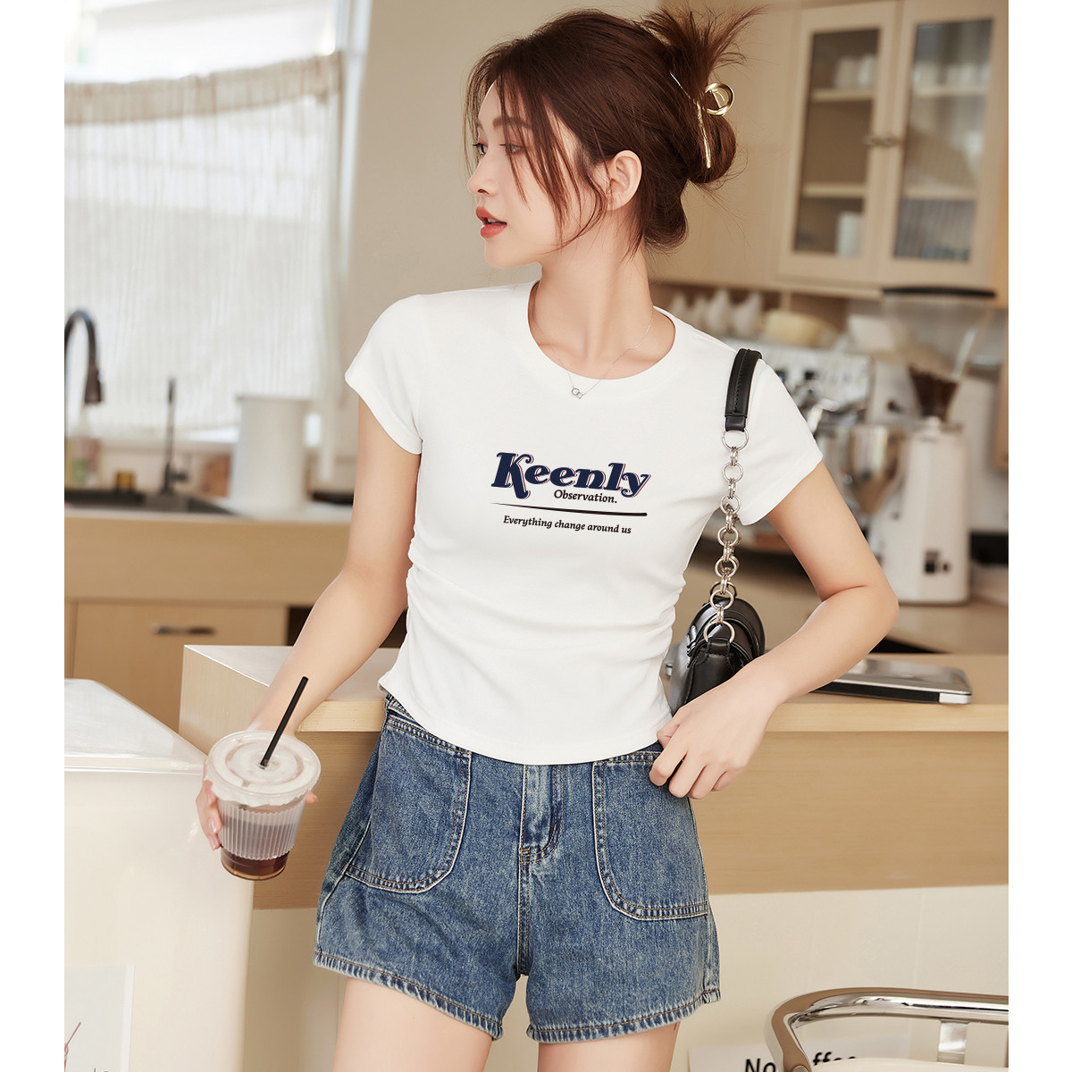 米子旗夏装款圆领印花T恤女侧边褶皱修身短袖上衣 311066