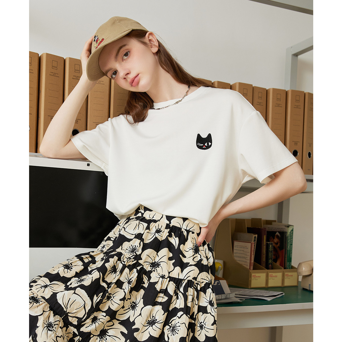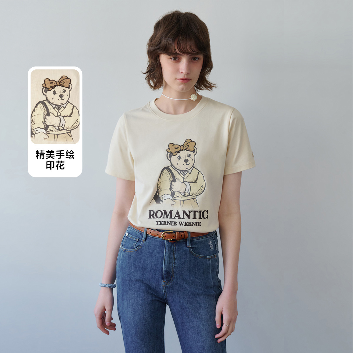 短袖T恤女夏季简约手绘风大熊图案刺绣圆领T恤打底衫女 319425