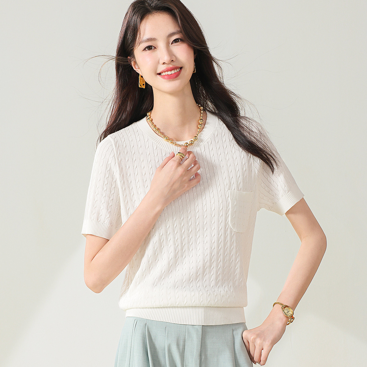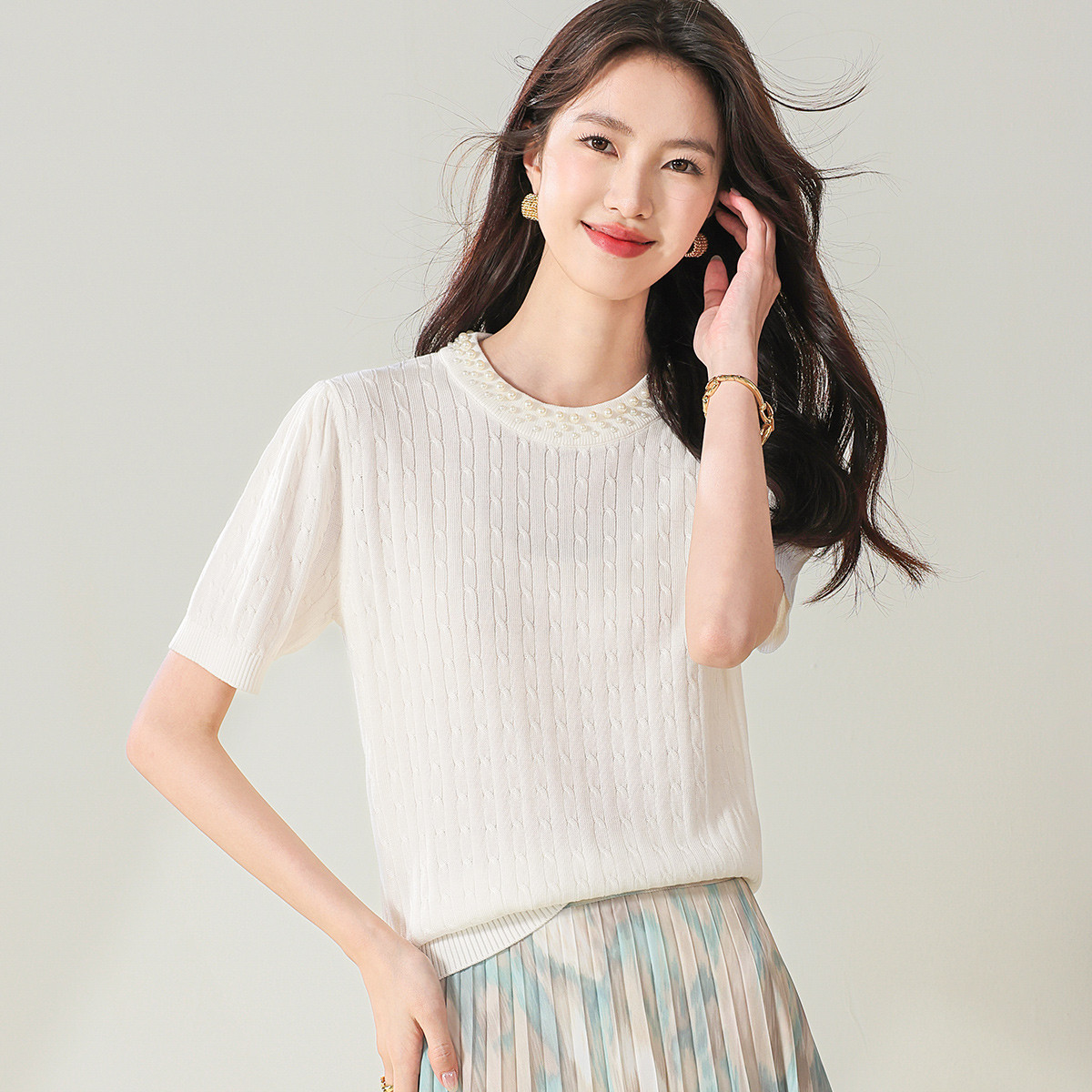 【小香风】轻薄透气圆领气质钉珠纯色含桑蚕丝短袖针织衫女T恤 521683
