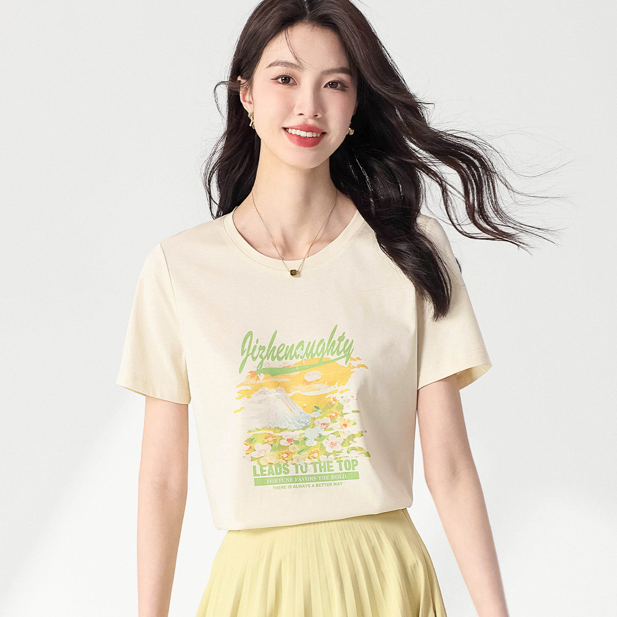 【含桑蚕丝】轻薄透气印花夏日油画圆领短袖T恤女薄款上衣 098067