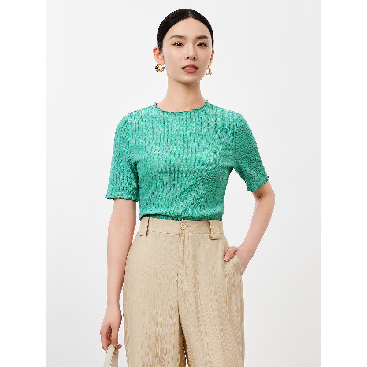 玖姿旗下安娜蔻系列肌理感褶皱花边修身上衣T恤女 226124