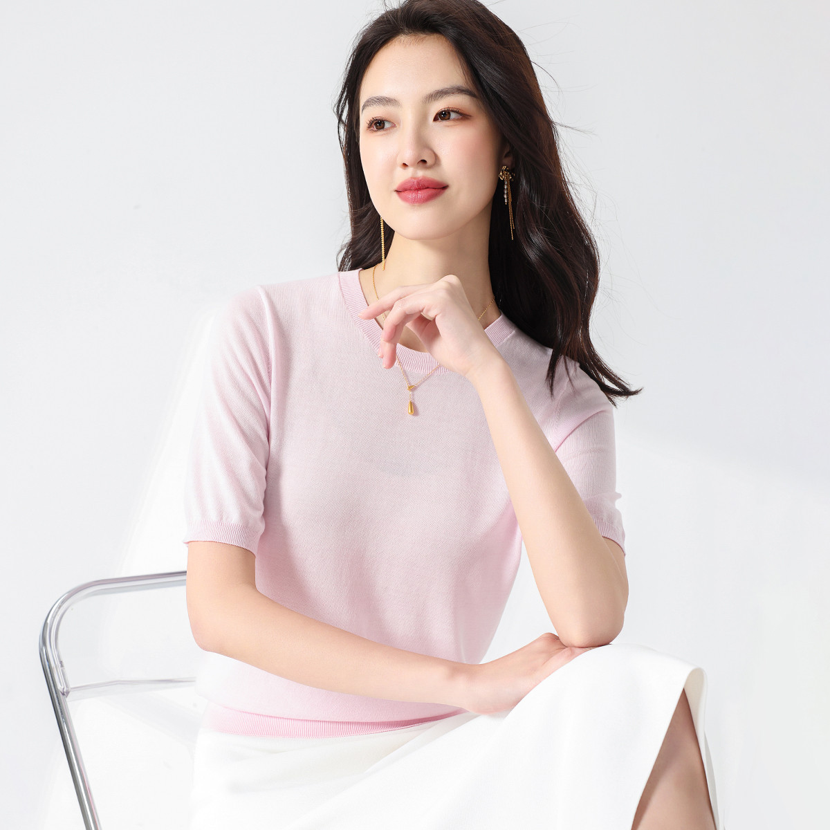 【含桑蚕丝】轻薄透气基础百搭纯色圆领针织打底衫短袖T恤女夏 158099