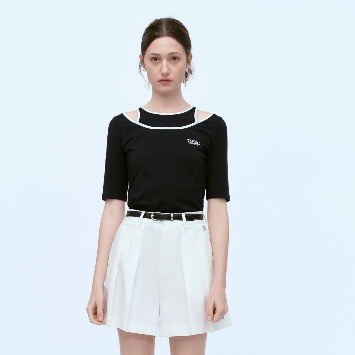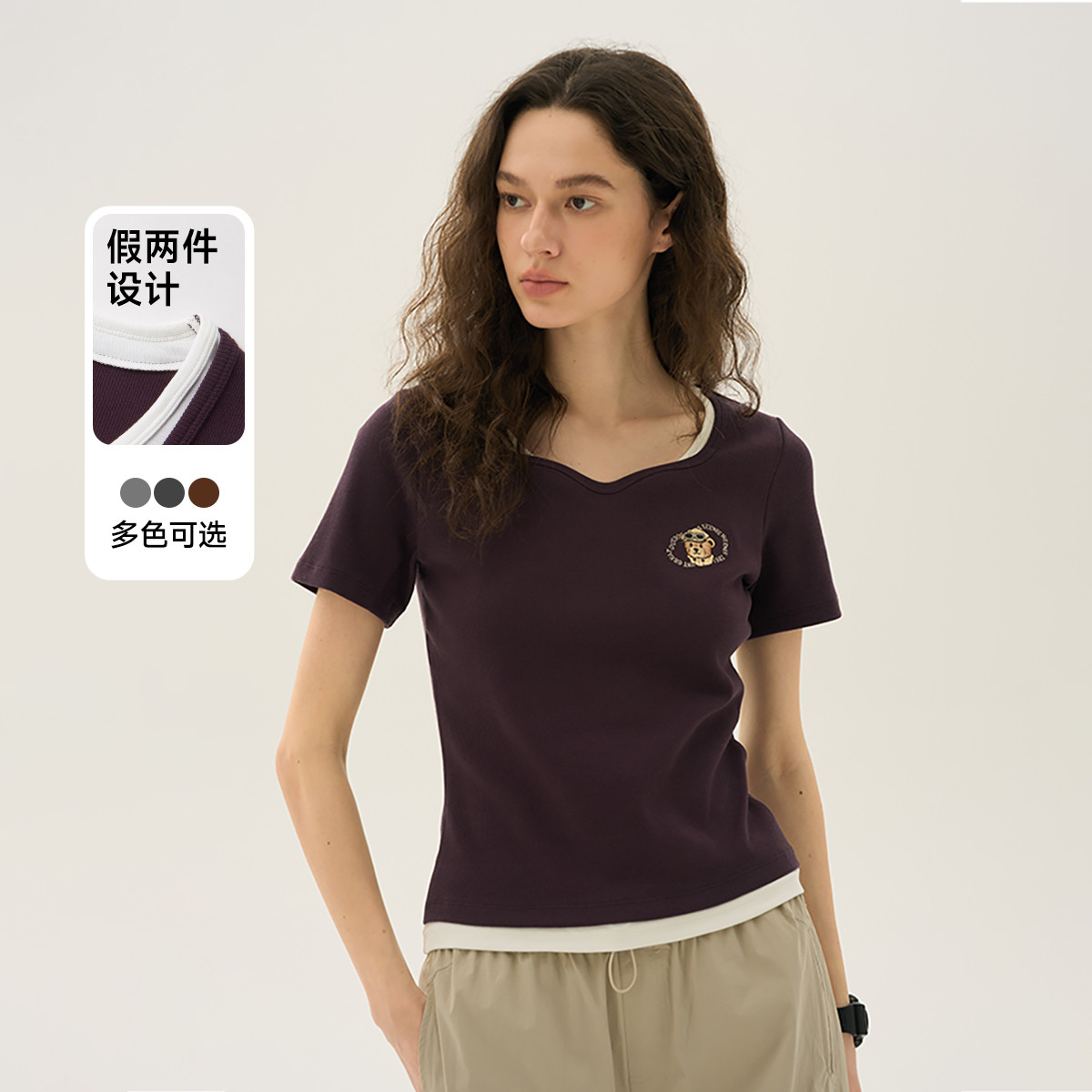 小熊女装夏季波浪领休闲撞色假两件短袖T恤修身上衣 888577