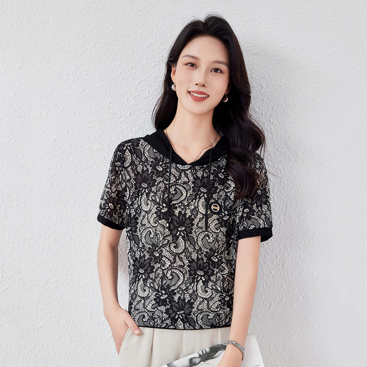 夏季气质高级感时尚撞色正肩连帽短袖女透气休闲针织T恤 644767