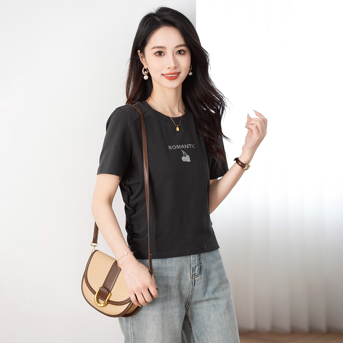灰色短袖t恤女夏季设计感小个子褶皱圆领正肩体恤上衣 960984
