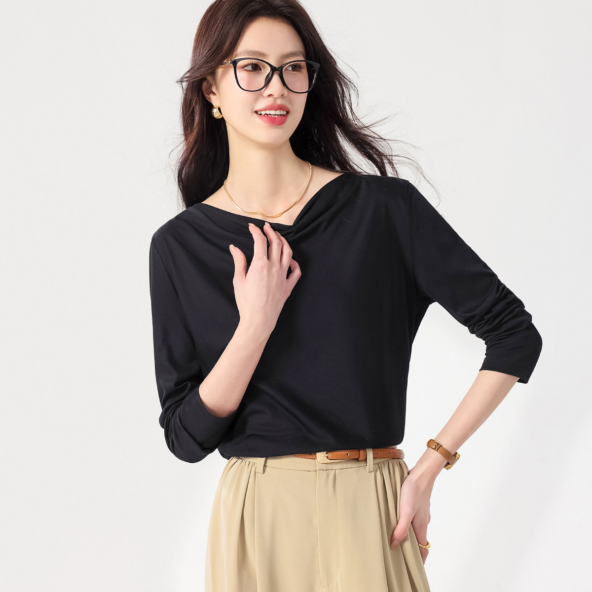 【一字领设计】夏季一字领弹力修身短款长袖T恤女 690970
