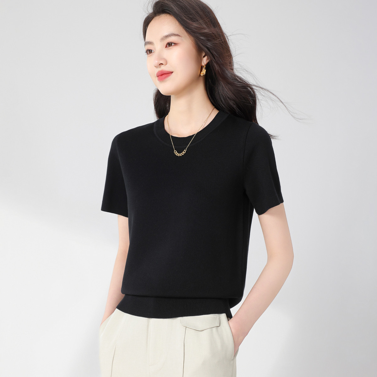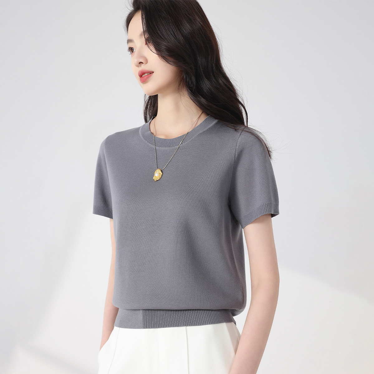 基础款纯色百搭圆领含桑蚕丝针织打底衫短袖T恤轻薄透气 043411