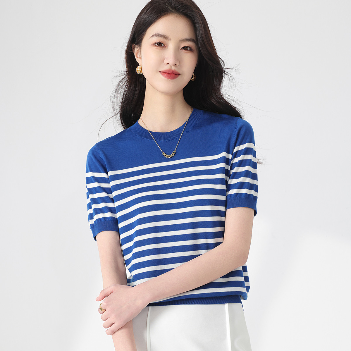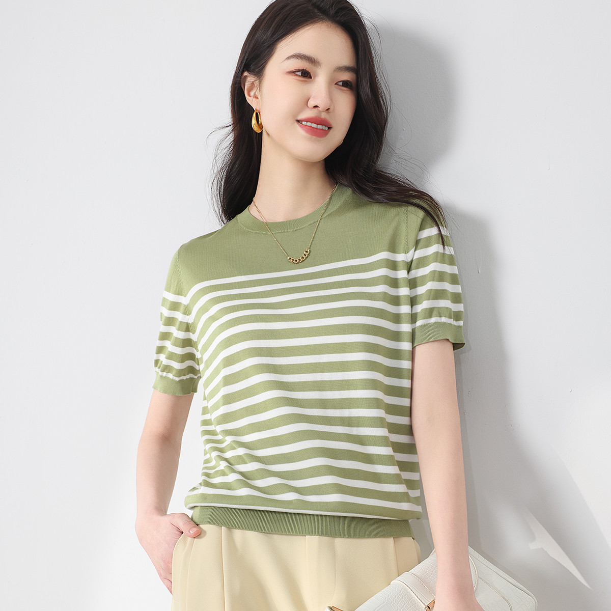 轻薄透气撞色条纹含桑蚕丝圆领短袖T恤针织打底衫 035219