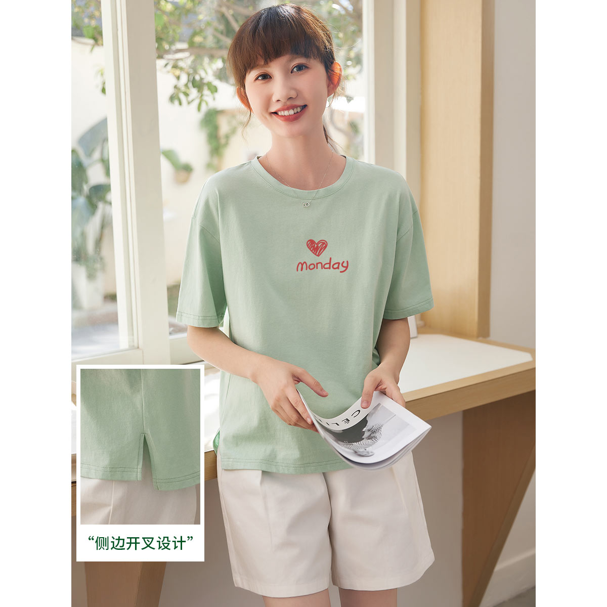 米子旗夏季圆领线条爱心印花大码T恤女侧边开叉宽松休闲短袖上衣 786266