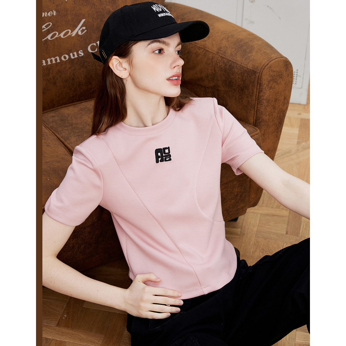 立体刺绣拼接个性时尚潮牌女式T恤夏季正肩圆领短袖上衣 829277