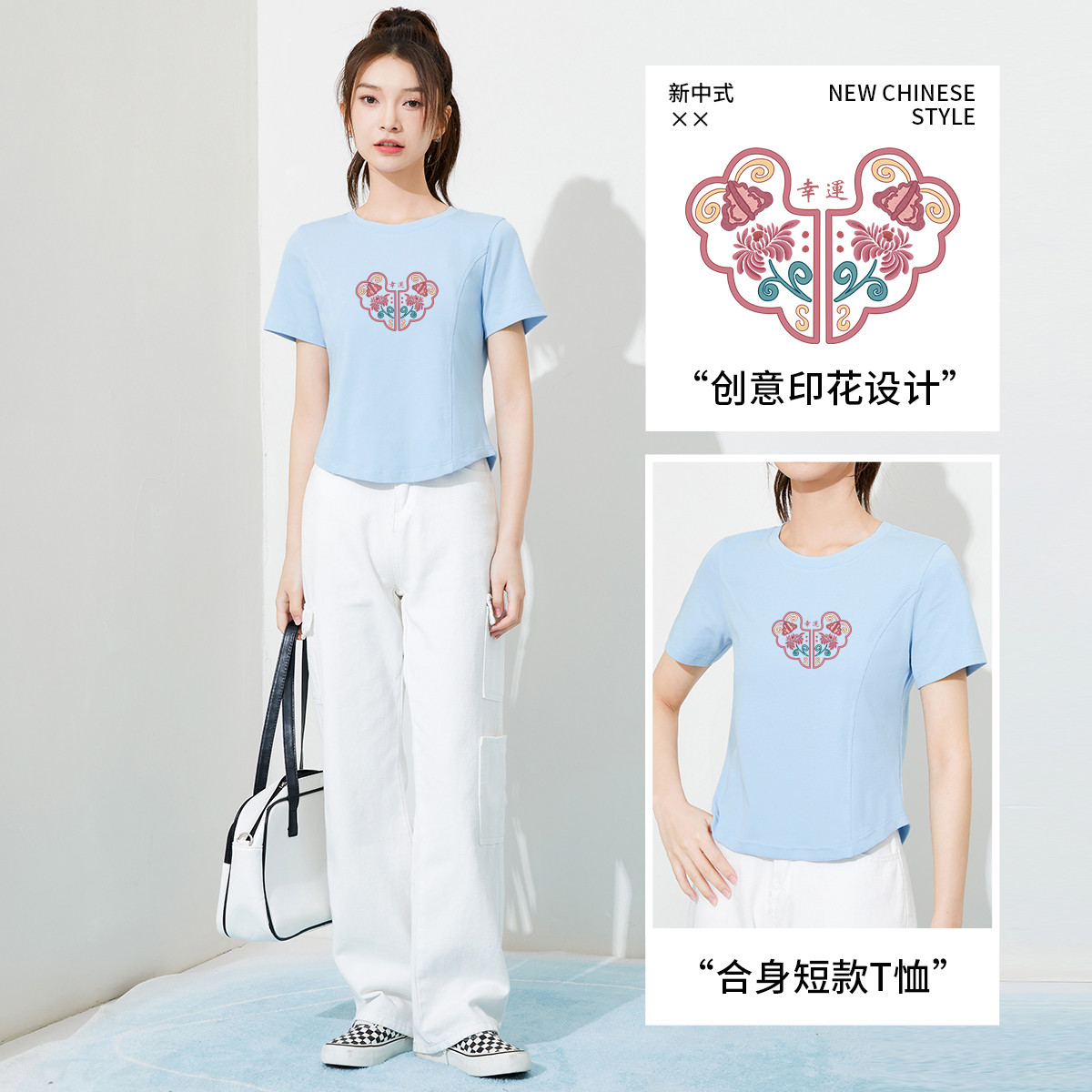 米子旗夏季圆领新中式国风印花T恤女短款修身减龄短袖上衣 176410