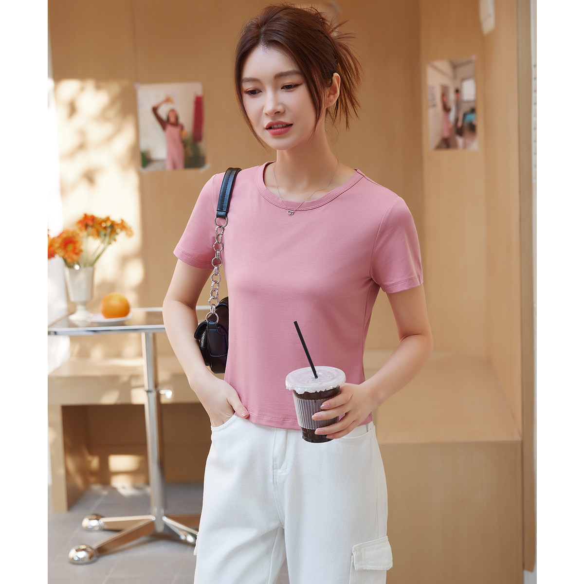 米子旗夏季简约纯色女式T恤基础版短款修身显瘦短袖上衣 408794