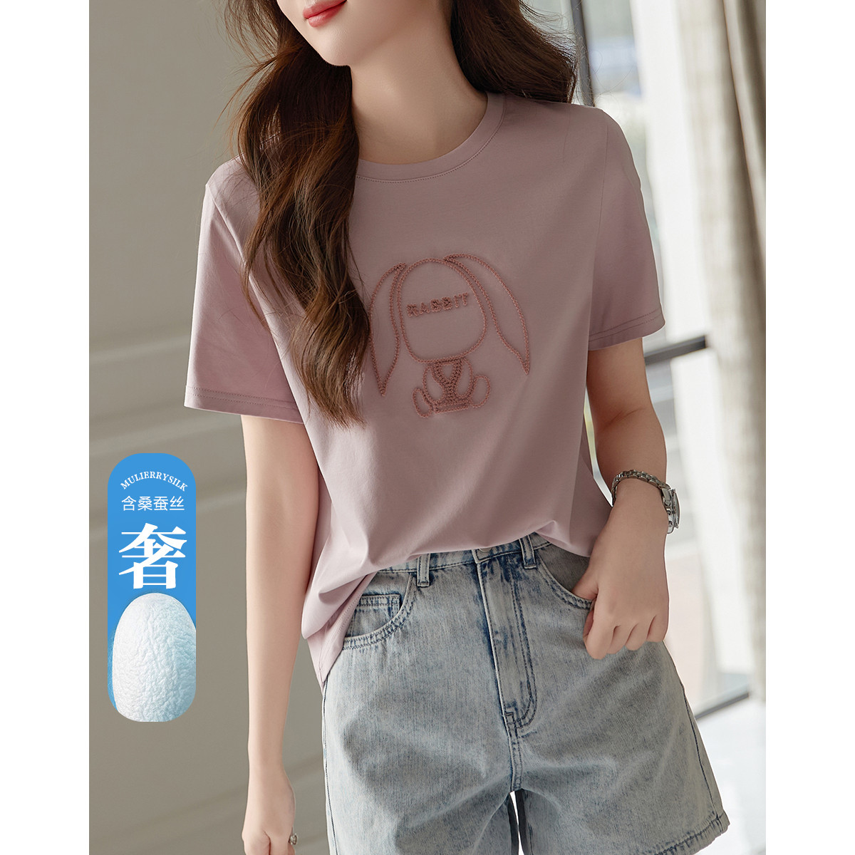 【含桑蚕丝180G丝光棉】夏季可爱风狗狗牙刷绣棉短袖女式t恤 980161