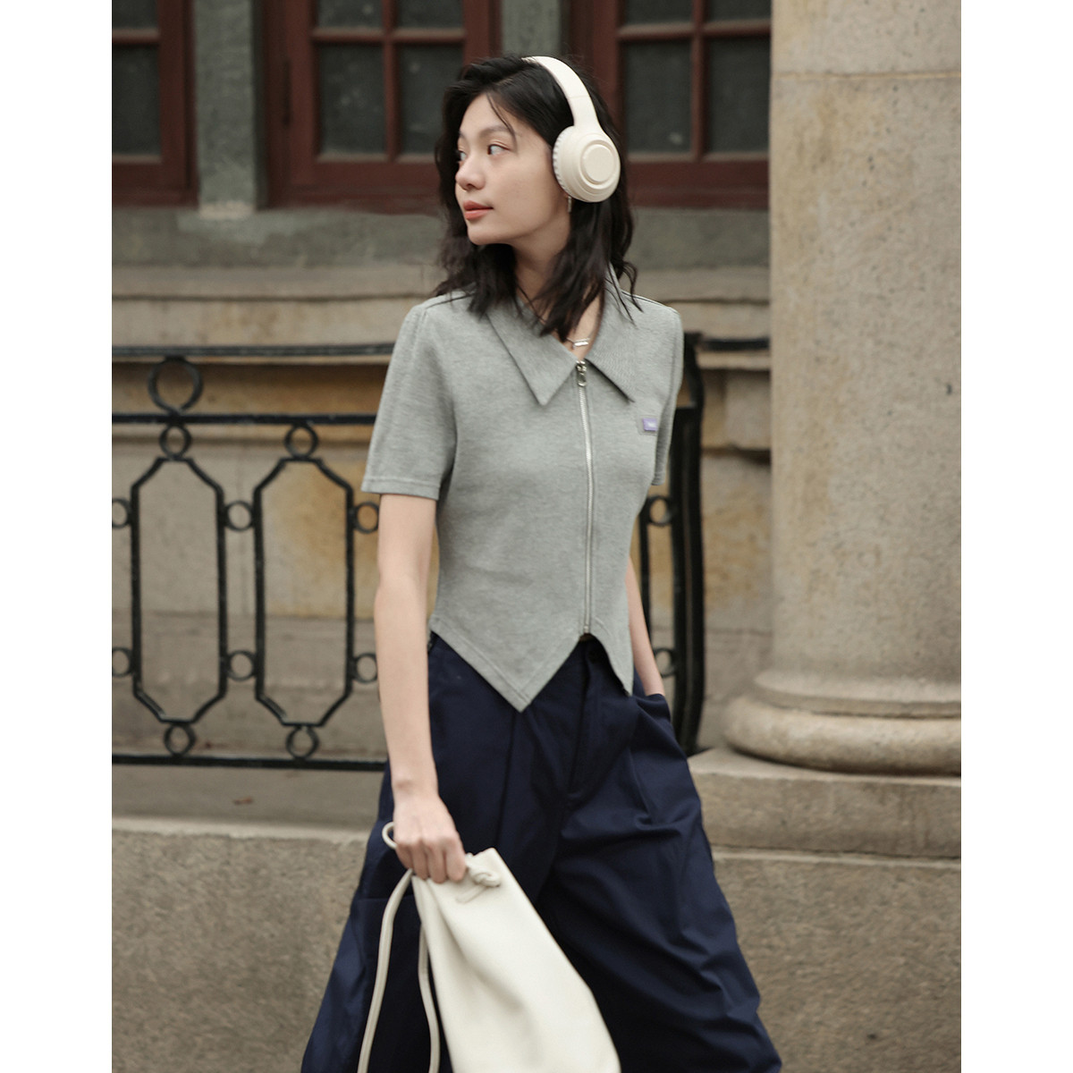 【学院风浅灰短上衣】夏款翻领开衩显瘦短袖针织短袖女 124418