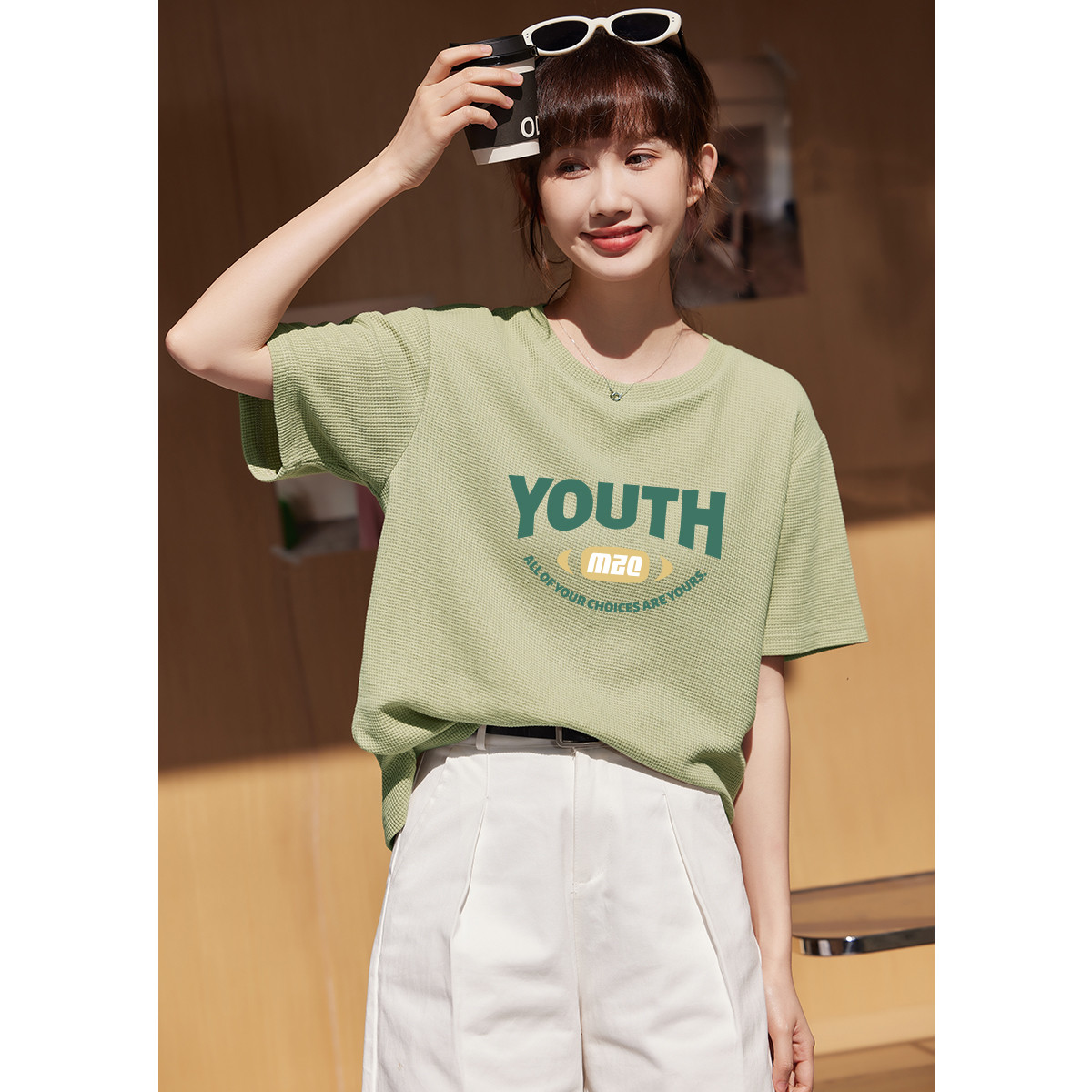 米子旗夏季圆领创意印花女式T恤华夫格设计宽松休闲短袖上衣 496026